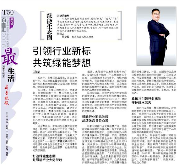 2016年,是桑樂擁抱社會、改革進取、銳意創新的一年,桑樂當家人王雪廣先生邀請到了管理經驗豐富且深諳市場營銷的馬全軍出任桑樂集團執行總經理,全面提升系統管理,樹立全新網點銷售形象;積極完善產業鏈條,加快研發企業新品;改革營銷策略,建立多元化傳播理念;邀請倪萍擔任桑樂品牌形象代言人并提出桑樂新能源,綠能發展——“LE+綠能生態圈”戰略,將企業乃至行業的戰略發展方向提升至全新高度。